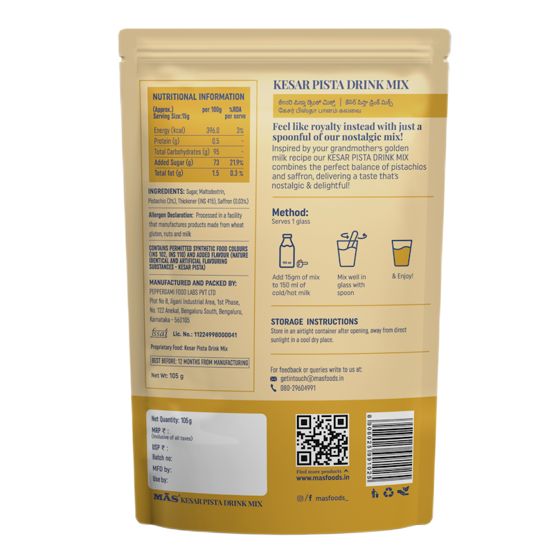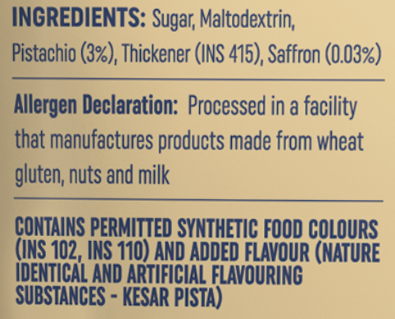 CONTAINS PERMITTED SYNTHETIC FOOD COLOUR (INS 102, INS 110) AND ADDED FLAVOUR (NATURE IDENTICAL AND ARTIFICIAL FLAVOURING SUBSTANCES – KESAR PISTA)